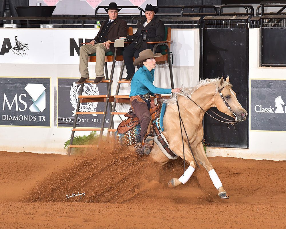 Casey Deary and the Arcese Quarter Horses USA bred, owned and nominated Belissimo (Magnum Chic Dream x Americasnextgunmodel) closed the finals with a bang. A monster 231.5 is what it took to clinch the MS Diamonds TX Level 4 Open Futurity Championship and a check for $350,000. Deary also tied for reserve and earned $130,000 with Maverickbuzthetower (Americasnexttopgun x Chics Vintage Flare) owned by Bosque Ranch Performance Horses LLC, bred by Spradling Unlimited LLC and nominated by Glenn Spradling; not to mention another $25,000 with Hello Pretty Woman (Walla Walla Whiz x Americasnextgunmodel) owned, bred and nominated by Arcese Quarter Horses USA. The total check of $505,000 pushed Deary over the NRHA $6 Million Rider mark. Casey wasn’t the only Deary to take home a piece of the pie—his son, Owen, won more than $102,000 in the Non Pro division a day before.